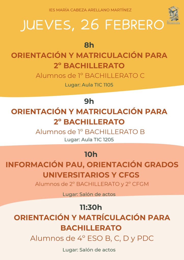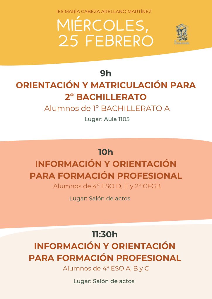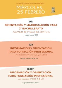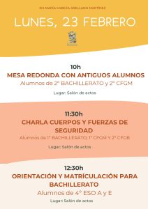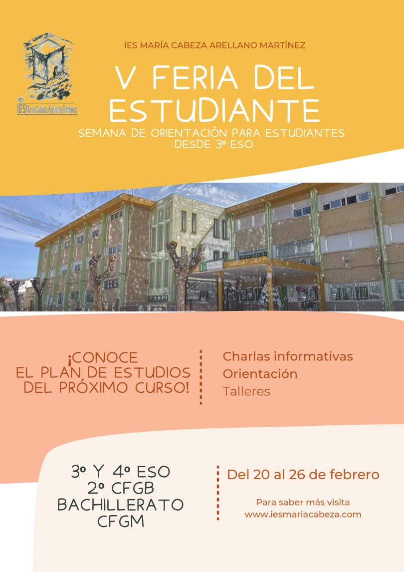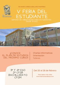 Como en años anteriores, en este curso escolar, nuestra feria del estudiante tendrá lugar en este caso, del día 20 al 26 de febrero. En ella, el alumnado de 3º y 4º de la ESO, Ciclos Formativos y Bachillerato, tendrán una serie de charlas y actividades para conocer las salidas del próximo curso escolar.